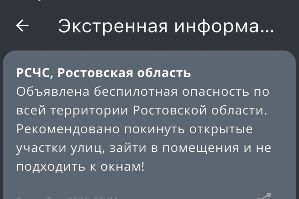В Ростовской области вечером 2 октября объявили об угрозе применения беспилотников. Жителям региона соответствующее уведомление от РСЧС пришло около 20:21.