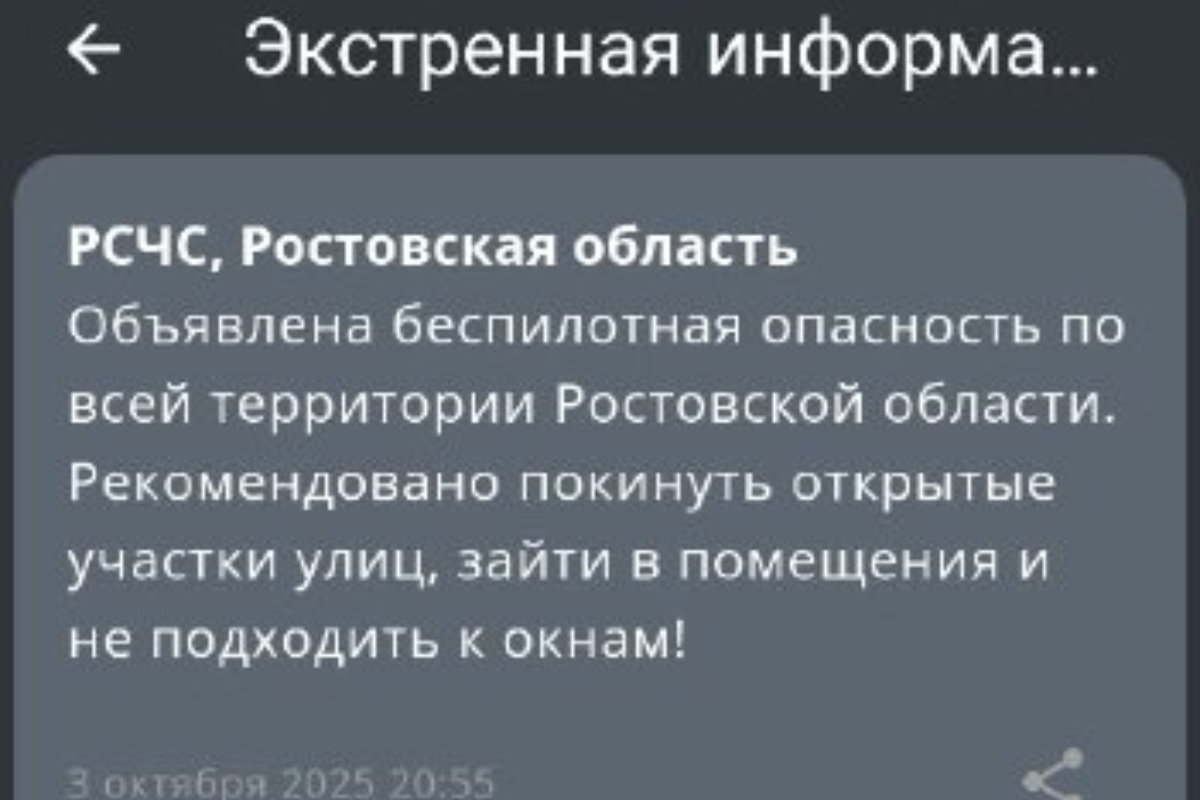 В Ростовской области объявили угрозу атаки беспилотников. Соответствующее уведомление жителям региона пришло 3 октября около 20:55.
