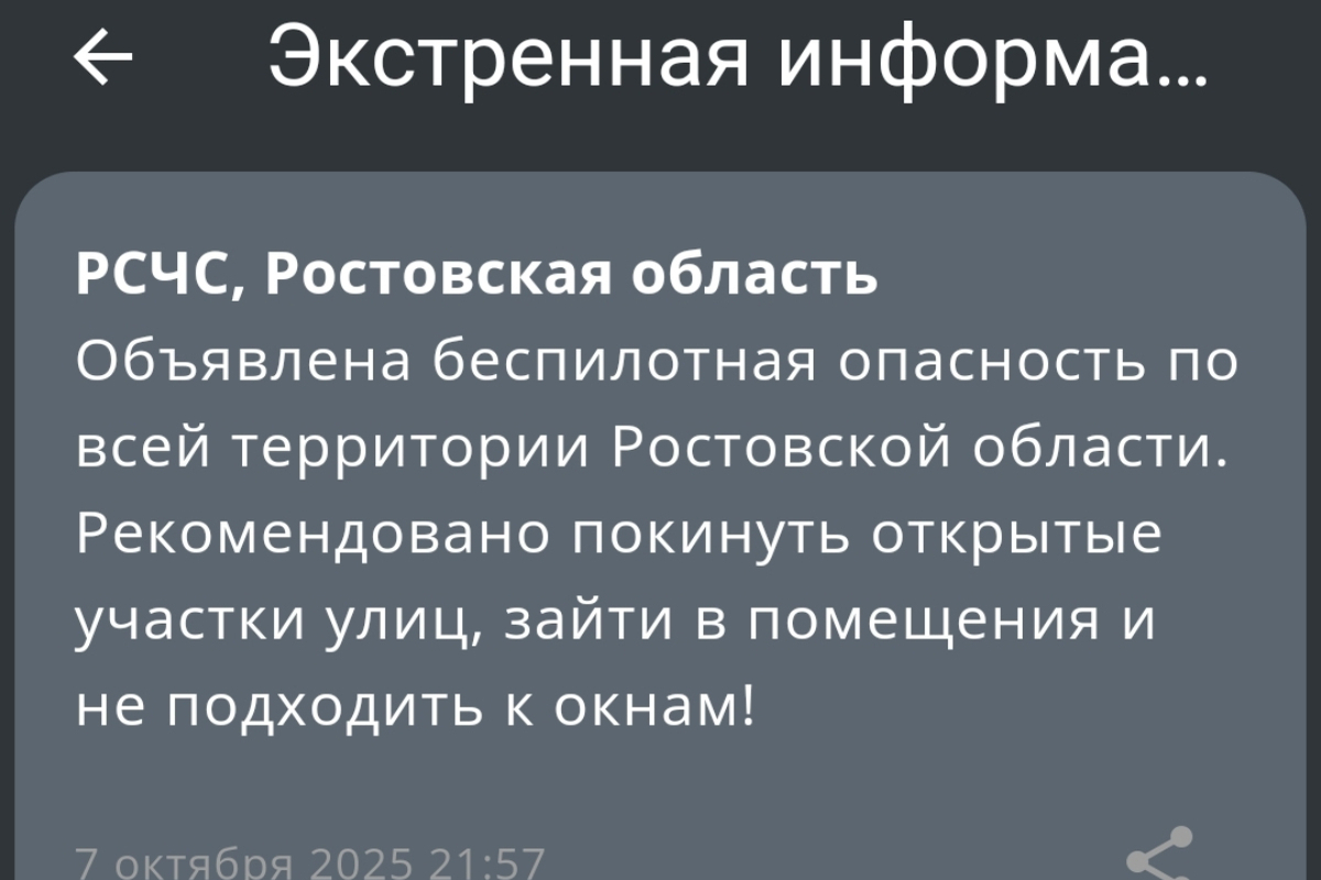 В Ростовской области объявили угрозу атаки беспилотников. Соответствующее уведомление жителям региона пришло 7 октября около 21:57.