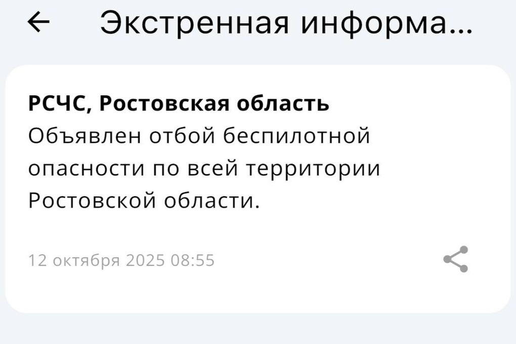 Примерно в 8:55 жители Ростовской области получили извещение от РСЧС об отмене режима опасности, связанного с беспилотными летательными аппаратами.
