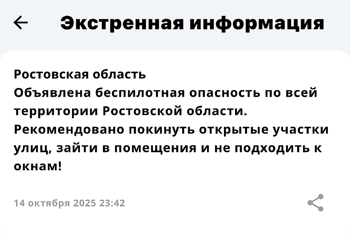 Беспилотная опасность объявлена в Ростовской области 14 октября. Об этом сообщает РСЧС около 00:00.