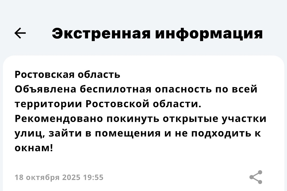 В Ростовской области дважды за вечер объявили беспилотную опасность . Экстренно сообщение поступило 18 октября.