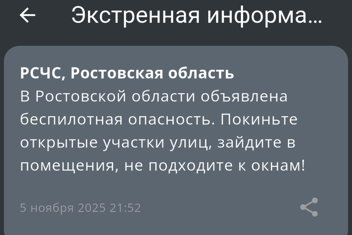В Ростовской области ввели режим беспилотной опасности 5 ноября. Уведомление от РСЧС пришло примерно в 22:00.