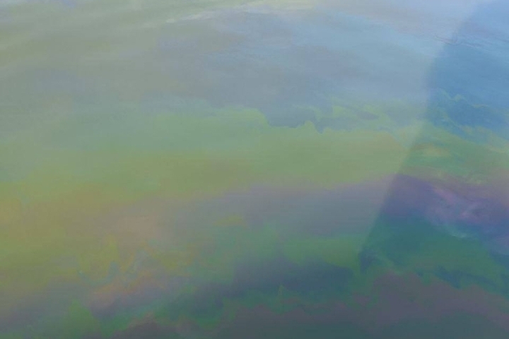 На видеозаписи запечатлена маслянистая пленка с радужным оттенком, покрывающая всю поверхность затона, со слов местных жителей от воды исходит сильный дизельный запах, затрудняющий дыхание.