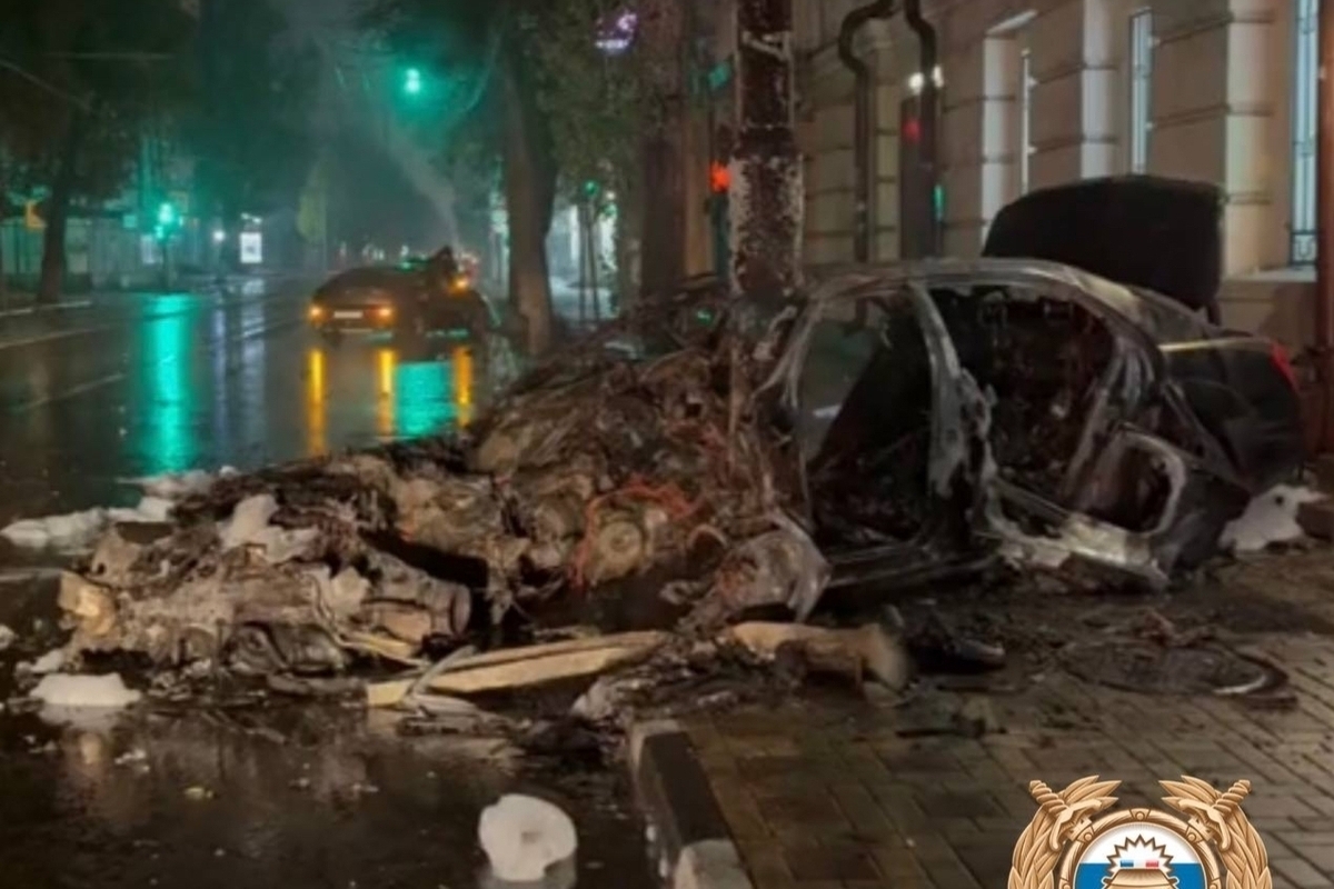 Иномарка сгорела дотла, после столкновения с опорой ЛЭП в Ростове-на-Дону. Инцидент случился ночью 13 ноября на пересечении улиц Советской и Верхненольная.