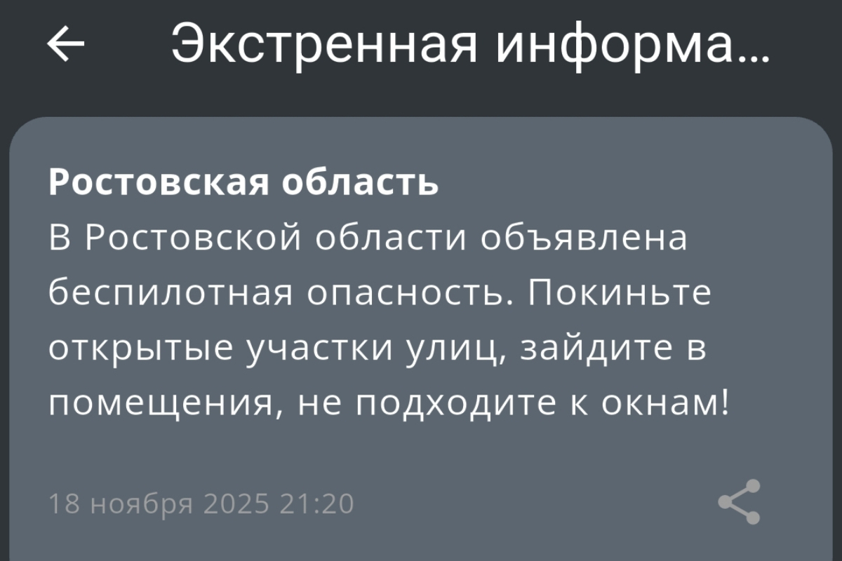Режим беспилотной опасности объявили в Ростовской области. Сообщение от Единой государственной системы предупреждения и ликвидации ЧС поступило вечером 18 ноября.