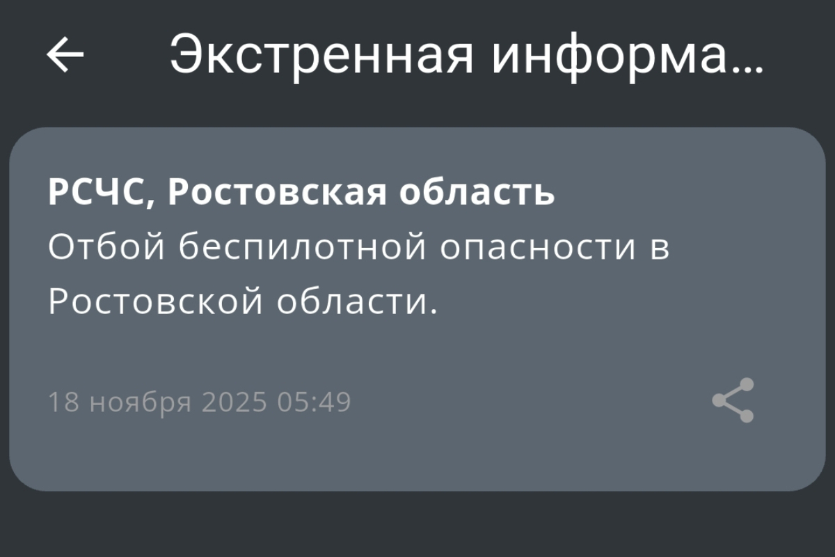 Предупреждение об опасности атаки дронов на донской регион пришло 17 ноября около 23:30. Местным жителям поступили рекомендации зайти в помещения и отойти подальше от окон.