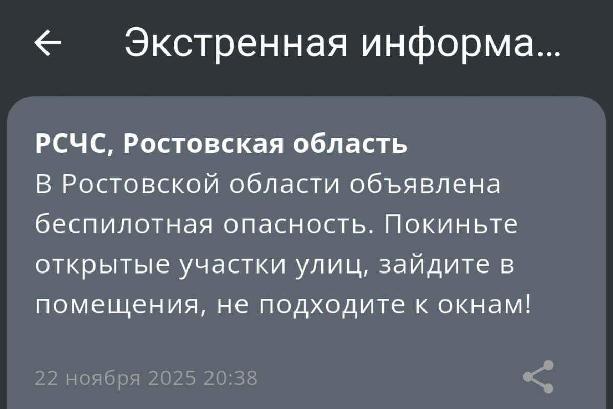 Режим беспилотной опасности объявили в Ростовской области вечером 22 ноября. Сообщение от Единой государственной системы предупреждения и ликвидации ЧС пришло около 20:30.