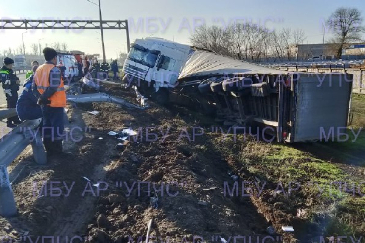 Предварительно, грузовик «DAF» проезжал Аксайский район. Фуру занесло в кювет. Она снесла дорожное ограждение и завалилась на бок.
