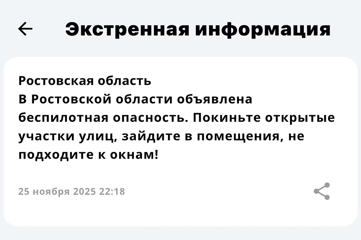 Опасность из-за беспилотников объявлена в Ростовской области 25 ноября. Уведомляет РСЧС.