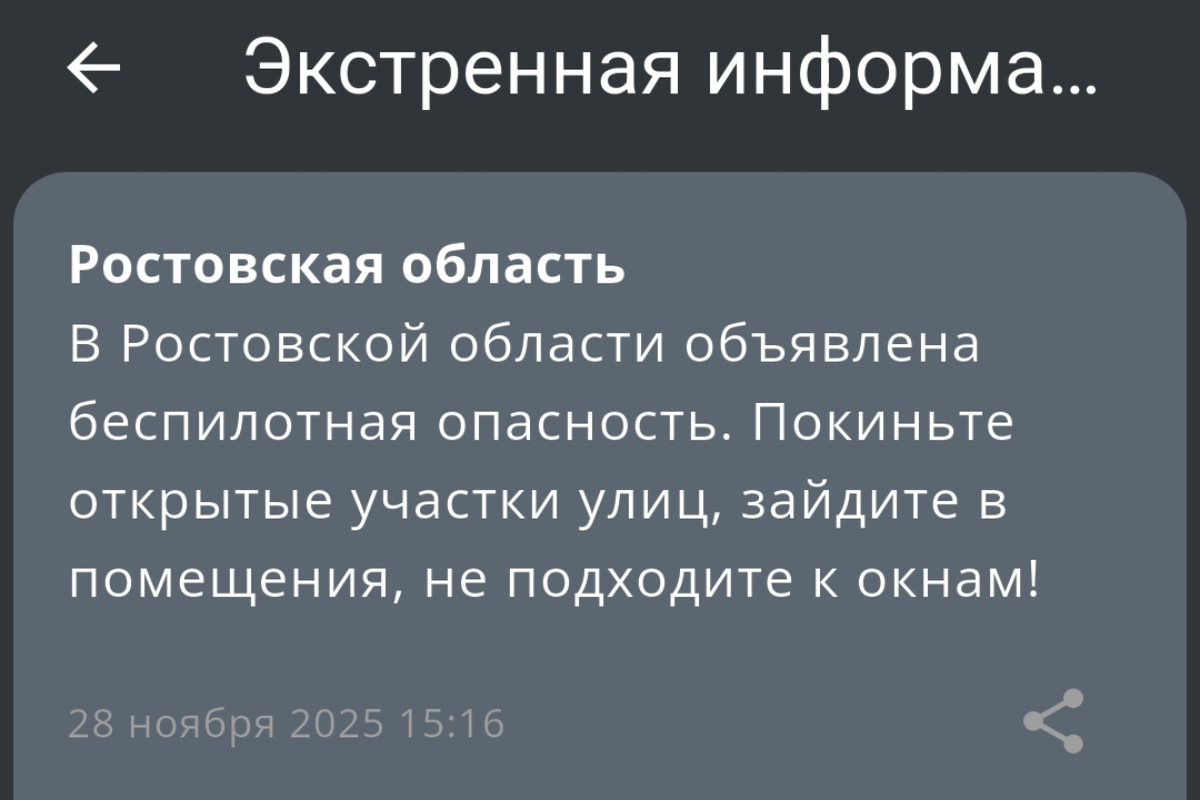 Днем 28 ноября в Ростовской области ввели режим беспилотной опасности. Уведомление от Единой государственной системи предупреждения и ликвидации ЧС пришло примерно в 15:30.