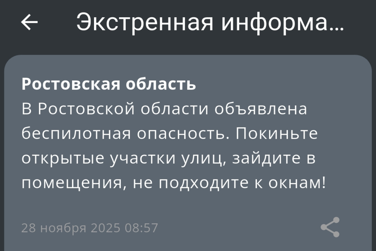 На Дону утром 28 ноября объявили беспилотную опасность. Уведомление от Единой государственной системы предупреждения и ликвидации ЧС поступило примерно в 9:00.
