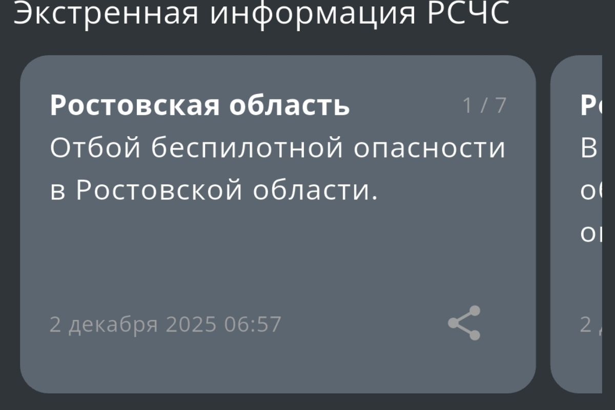 Режим опасности БПЛА в донском регионе был введен ночью 2 декабря. Примерно в 1:30 жителям поступили рекомендации зайти в помещения и отойти от окон.