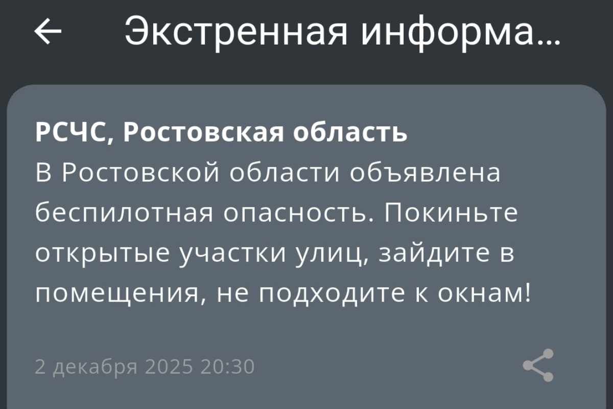 В Ростовской области вечером 2 декабря ввели режим опасности БПЛА. Уведомление от Единой государственной системы предупреждения и ликвидации ЧС поступило около 20:30.