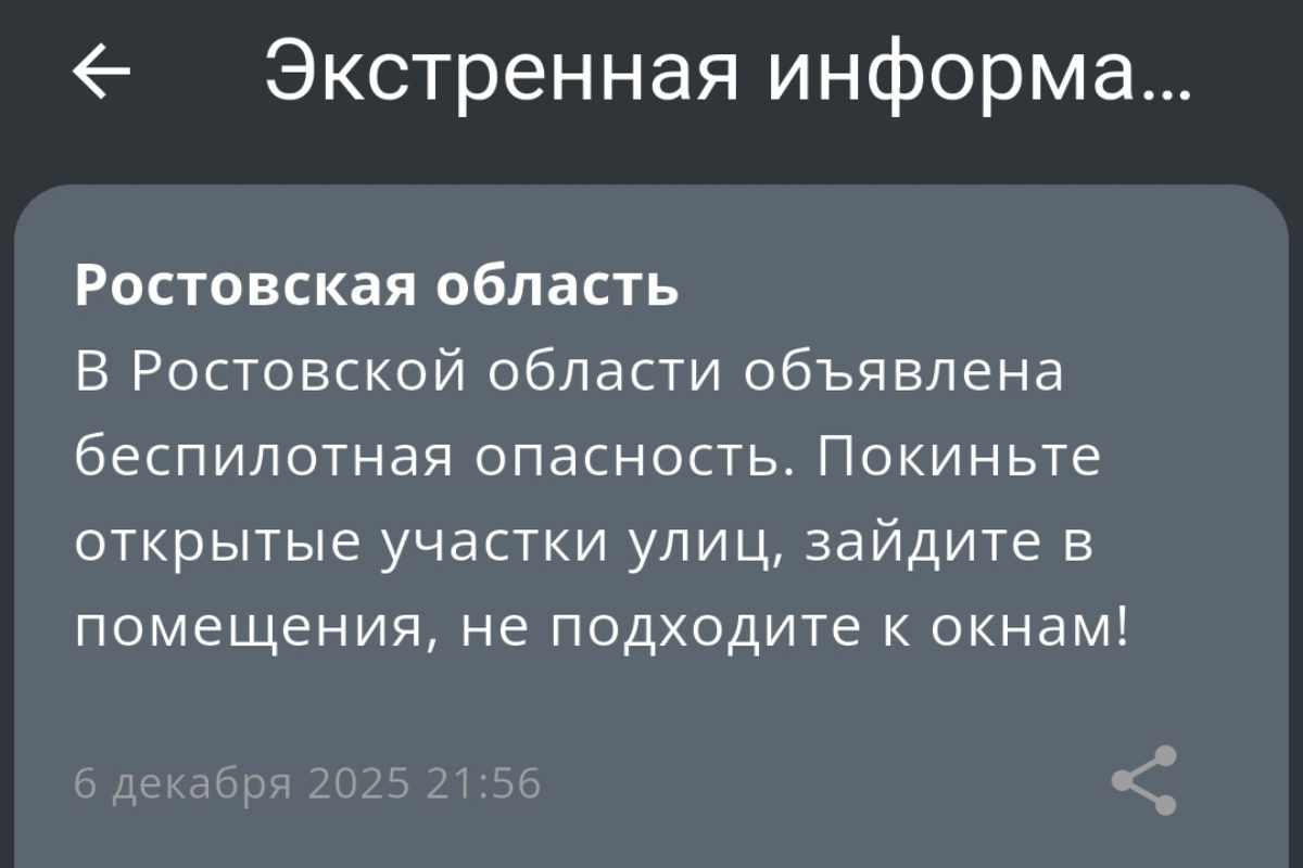 Режим беспилотной опасности ввели в Ростовской области вечером 6 декабря. Уведомление от Единой государственной системы предупреждения и ликвидации ЧС поступило около 22:00.