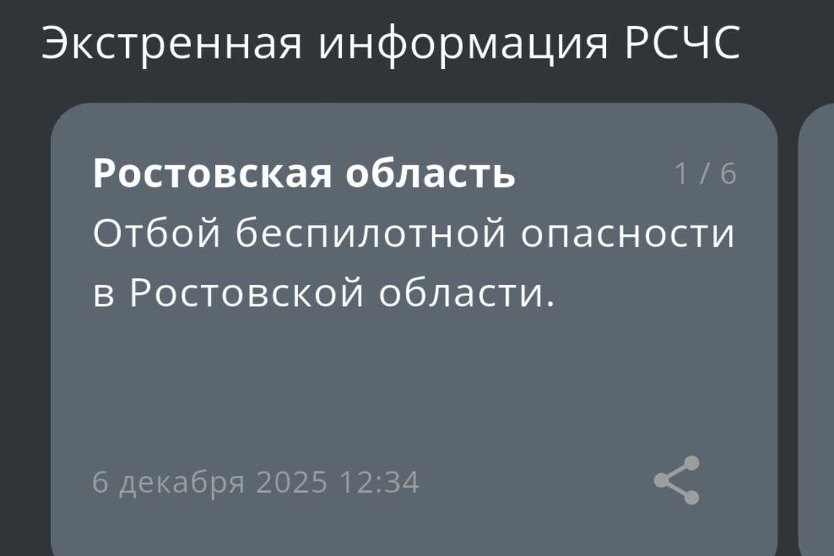 В Ростовской области дали отбой беспилотной опасности 6 декабря. Уведомление от РСЧС пришло примерно через час.