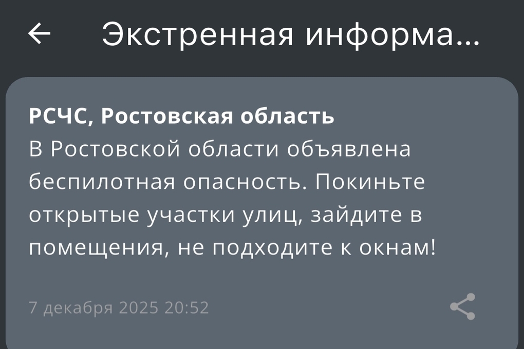 В Ростовской области в ночь на 7 декабря была объявлена тревога из-за угрозы атаки беспилотников. Региональное управление МЧС проинформировало об этом жителей.