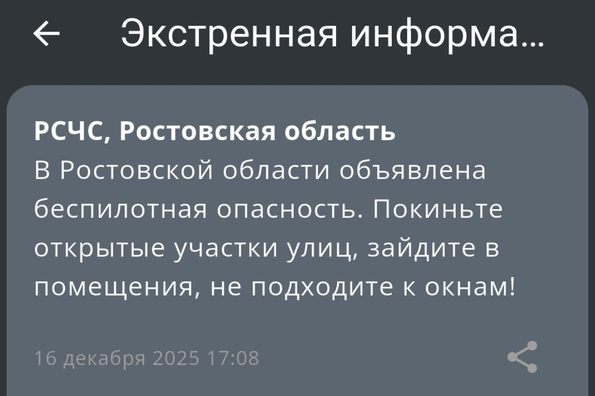 Жителей Ростовской области предупредили об угрозе атаки беспилотников вечером 16 декабря. Сообщение от Единой государственной системы предупреждения и ликвидации ЧС поступило примерно в 17:00.