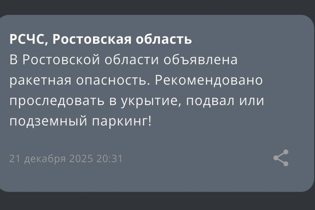 Поздним вечером, 21 декабря, на территории Ростовской области была объявлена ракетная опасность. Жители региона получили соответствующие уведомления около девяти часов вечера.