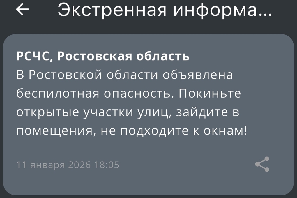 На территории Ростовской области вечером 11 января объявили беспилотную опасность. Об этом сообщили в РСЧС.