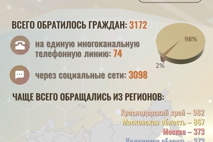 В первую тройку по количеству жалоб вошли Краснодарский край (982), Московская область (867) и Москва (373). На четвертом месте Калужская область (273). Топ-5 замыкает Ростовская область (271).