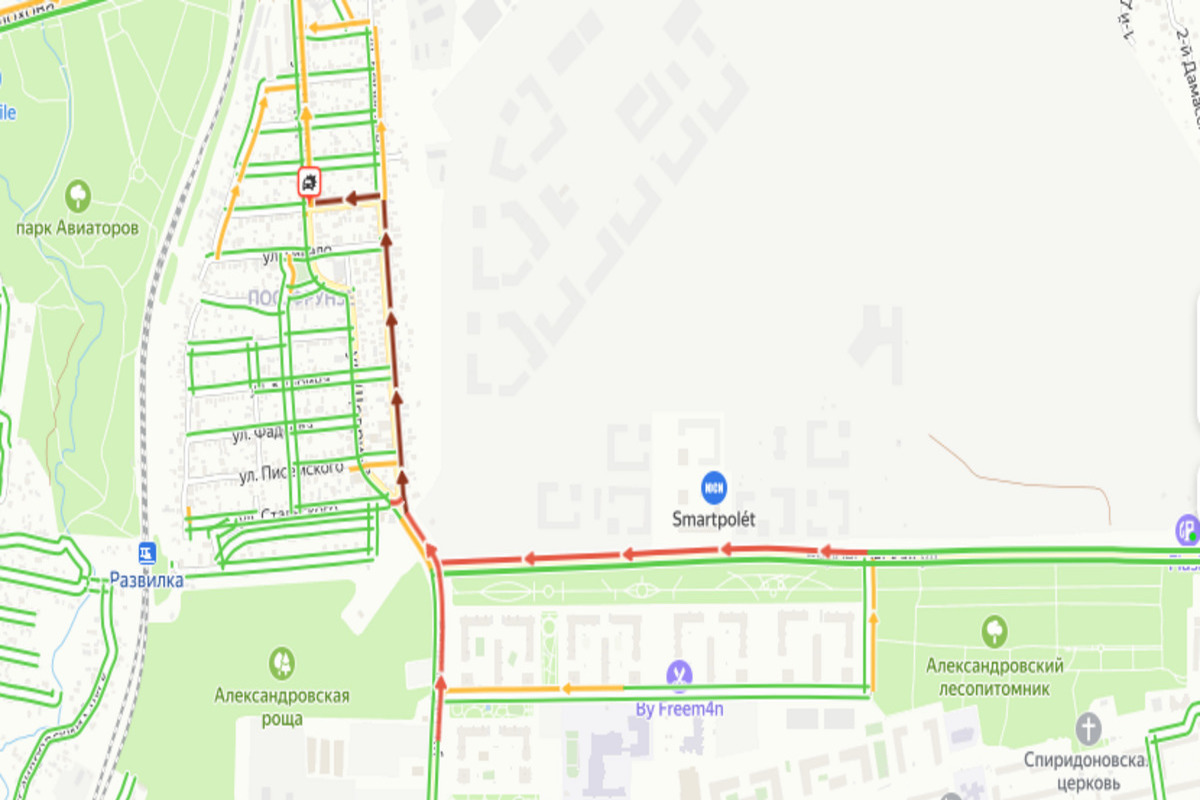 Пробка растянулась на несколько километров по улицам Щаденко, Вересаева и Берберовской. Там водители двигаются со скоростью не более десяти километров в час.