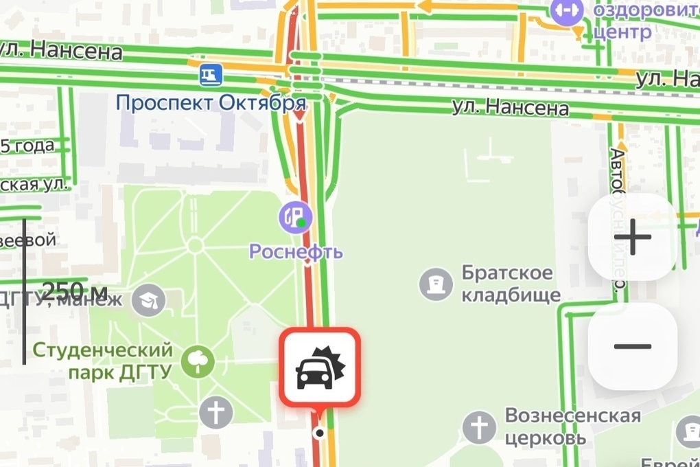 На проспекте Михаила Нагибина в Ростове-на-Дону произошло массовое ДТП, которое привело к серьёзным затруднениям в движении. Согласно информации сервиса «Яндекс.Карты», пробка растянулась на более чем три километра.