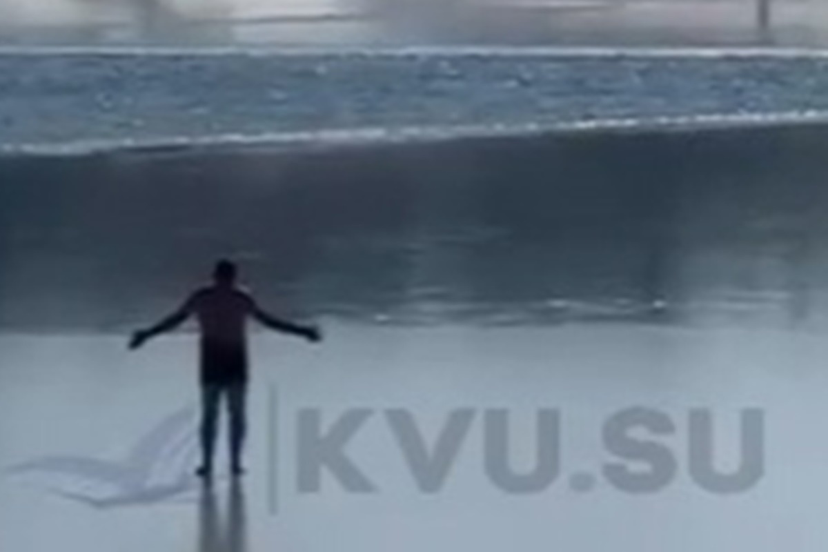 На пляже пруда 20 лет РККА оказался раздетый мужчина, который вышел на лед в одних плавках. Несмотря на очевидные риски, он смело двигался к центру водоема и даже несколько раз прыгнул, проверяя толщину льда.
