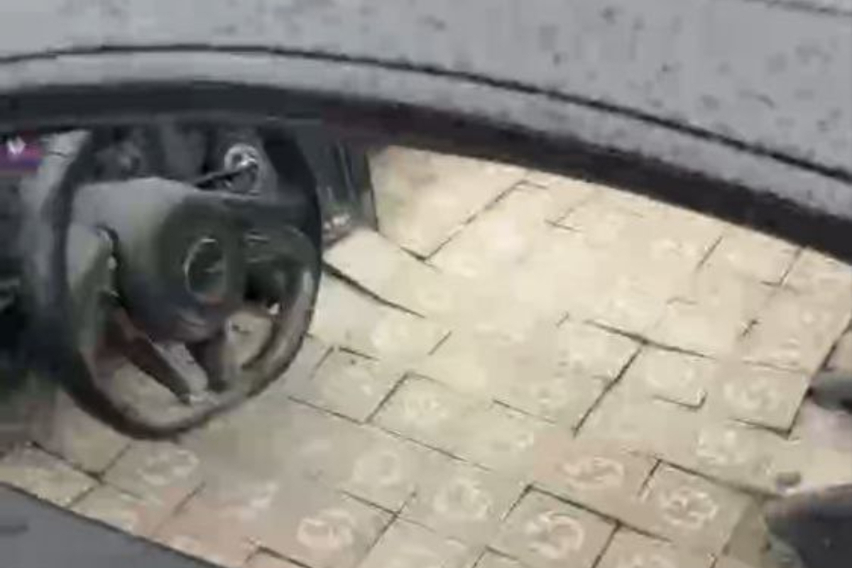 Экстремал забросал щебнем переднее сидения машины. Он залил битый камень строительной смесью с водой. Затем с помощью линейки и лопатки автор ролика выложил плитку.