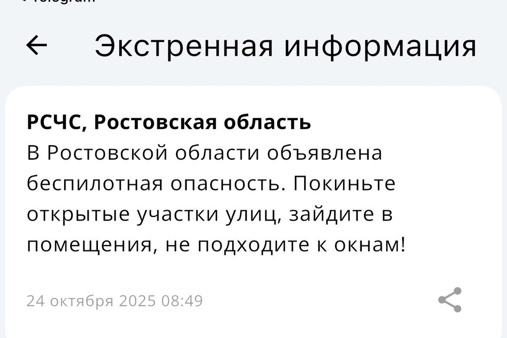 В Ростовской области 24 октября был введен режим угрозы беспилотных атак. Об этом сообщило РСЧС около 09:00.
