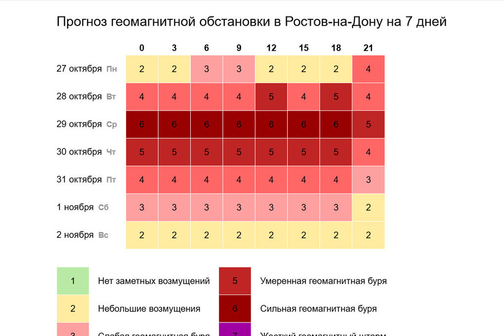 В конце октября в Ростовской области будут сильные магнитные бури. На сайте time-in можно посмотреть календарь магнитных бурь на октябрь 2025 года.