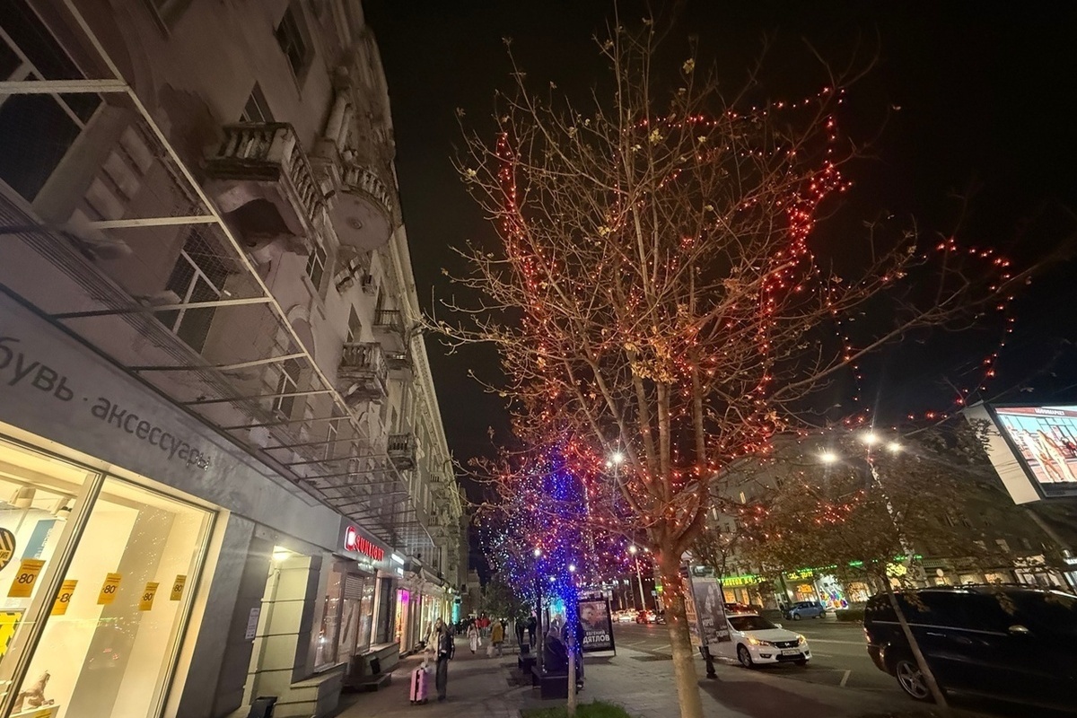 На улице Большой Садовой, 50 деревья украсили гирляндами. Вероятно это сделали владельцы ближайших заведений.