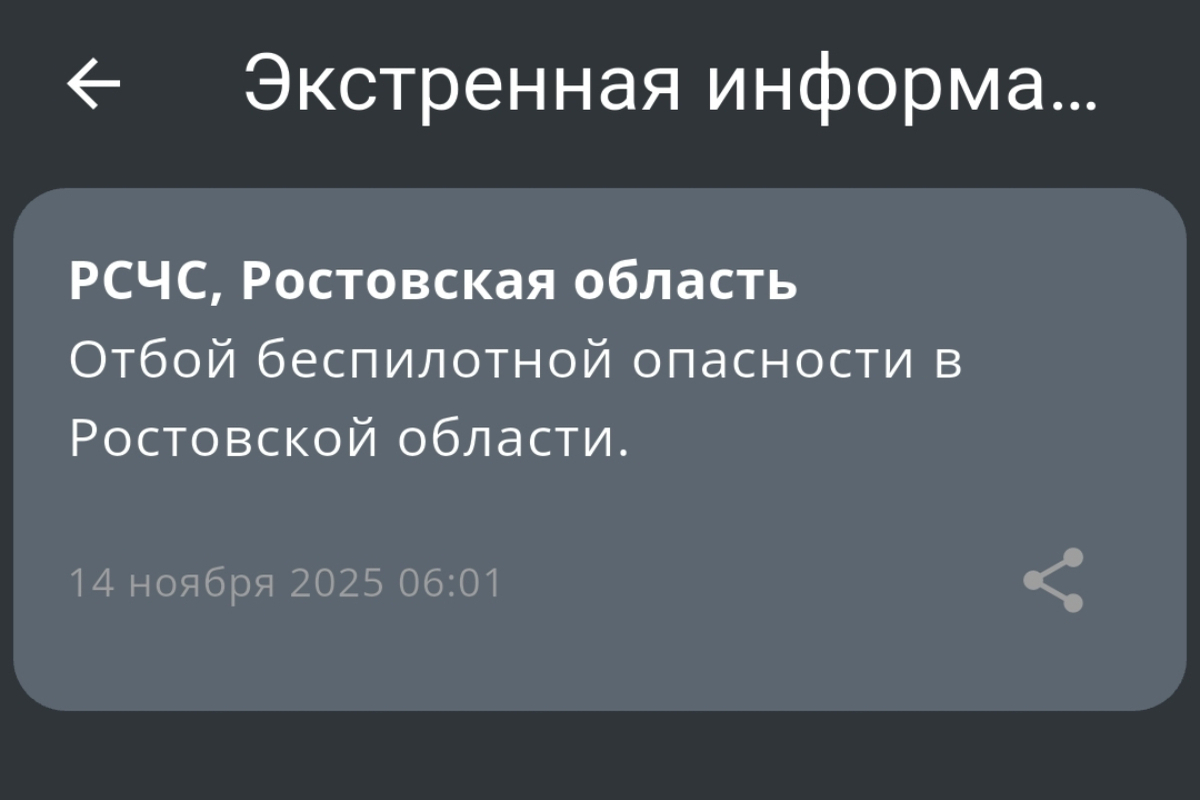На Дону отменили режим беспилотной опасности 14 ноября. Сообщение от Единой государственной службы предупреждения и ликвидации ЧС поступило около 6:00.