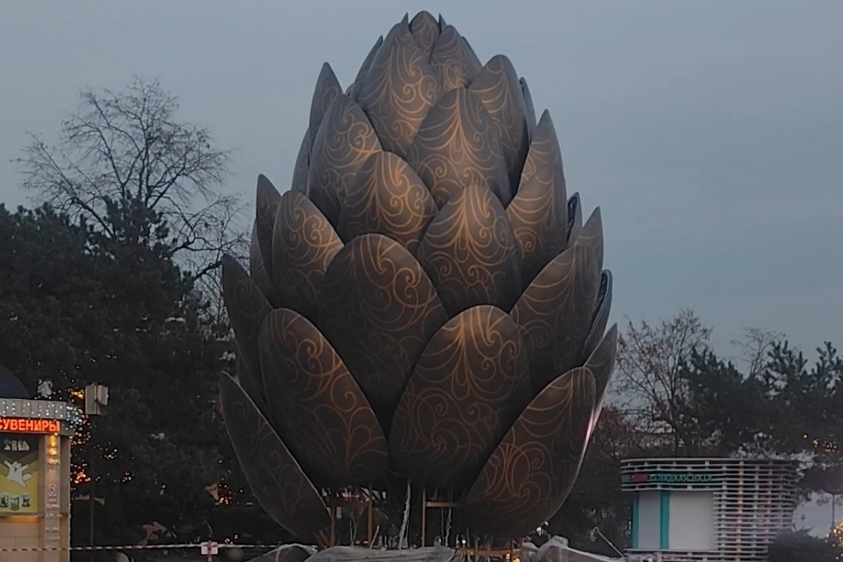 Пока что монтаж конструкции еще не закончен, шишка ограждена сигнальной лентой. Она оборудована иллюминацией и должна светиться вечером.