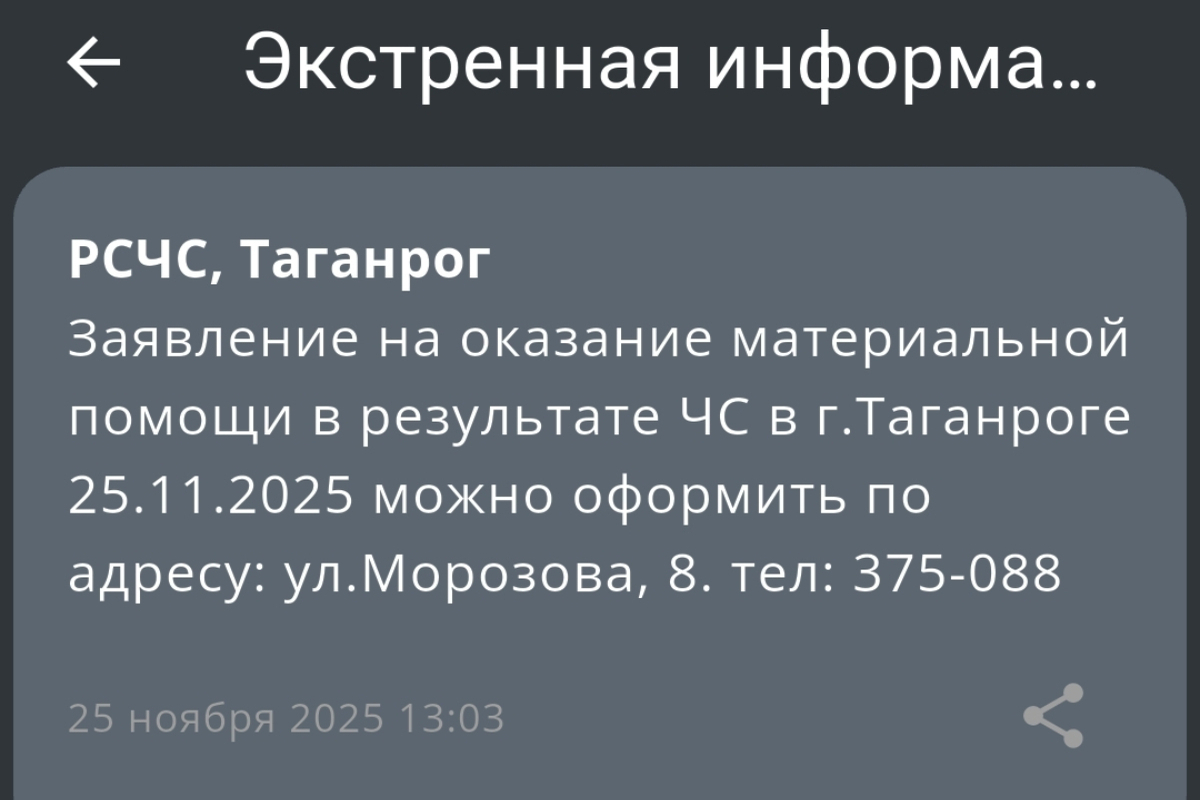 Жителям Таганрога сказали, куда обращаться для получения материальной помощи. Массовая рассылка от Единой государственной системы предупреждения и ликвидации ЧС пришла 25 ноября.