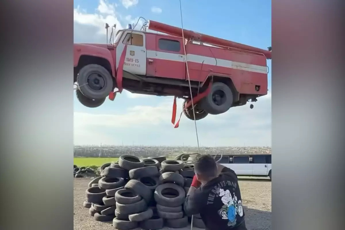 С помощью тросов мужчина подвесил большую технику над землей. Под машиной он уложил гору из шин. Затем Чеботарев надел каску и забрался внутрь конструкции. По сигналу тросы, удерживающие пожарную, освободились. За считанные секунды автомобиль упал вниз, подпрыгнув на груде резины. Евгения извлекли из горы шин живым и невредимым.