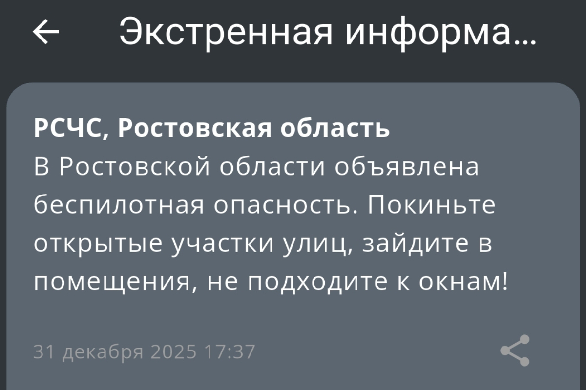 В канун Нового года в Ростовской области ввели режим беспилотной опасности. Сообщение от Единой государственной системы предупреждения и ликвидации ЧС пришло около 17:30.