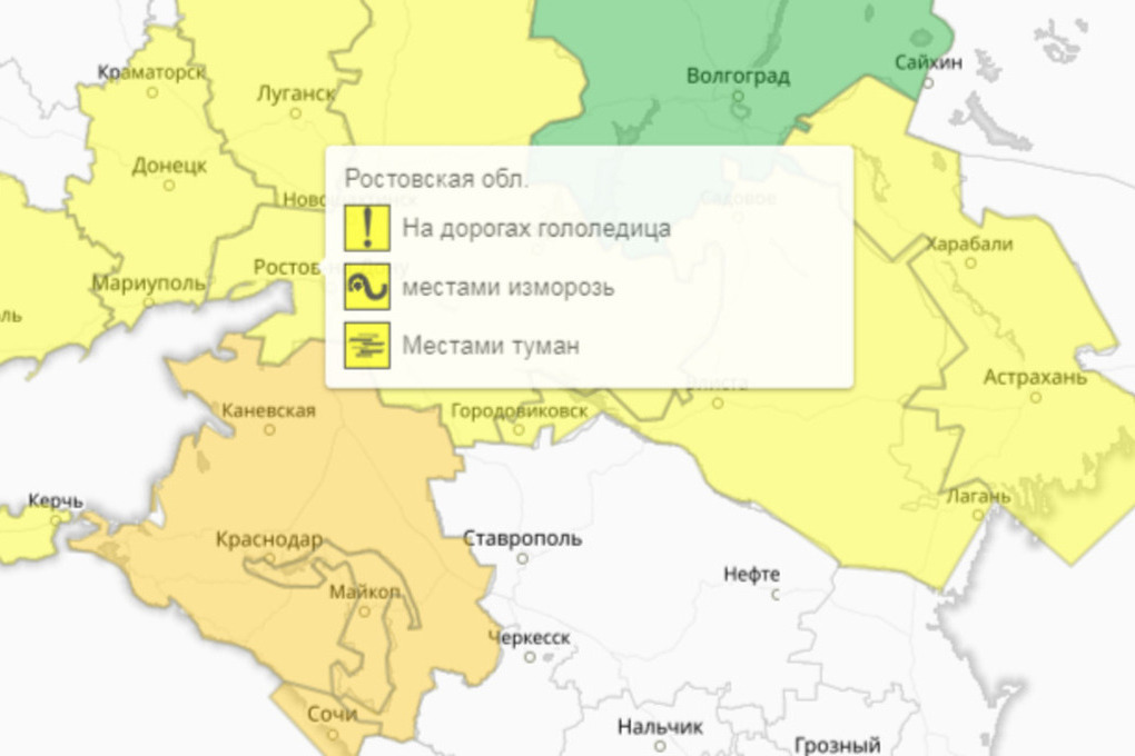 В Ростовской области продлен желтый уровень погодной опасности из-за неблагоприятных погодных условий, включающих туман, гололед и изморозь. Об этом сообщает Гидромедцентр России на своем официальном сайте.